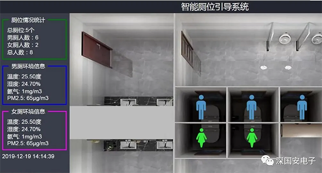 廁所想必一直是大家心中不太愿意提到的區(qū)域,傳統(tǒng)廁所由于缺少人員打理,異味較重,惡臭異味污染日益嚴(yán)峻,已成為行業(yè)備受關(guān)注的一個(gè)難題!為進(jìn)一步提高公共廁所管理水平,建立管理機(jī)制,建設(shè)現(xiàn)代新都市、塑造“智慧城市”的智能化公共廁所,深國安利用物聯(lián)網(wǎng)技術(shù),研發(fā)一款新型公廁專用物聯(lián)網(wǎng)臭氣在線監(jiān)測(cè)系統(tǒng),該設(shè)備通過物聯(lián)技術(shù)可實(shí)現(xiàn)對(duì)廁所人流、廁位空余、臭氣異味等環(huán)境進(jìn)行監(jiān)測(cè),并且通過配套軟件將信息實(shí)時(shí)顯示在大屏幕上。